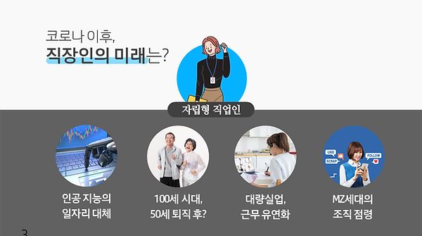 코로나 이후에는 자립형 직업인의 시대가 될 것입니다. 인간의 수명은 100세를 바라보지만 퇴직 연령은 높아지지 않았습니다. 코로나 이후 대규모 구조조정이 예고되어 있고, 엎친 데 덮친 격으로 인공 지능이 일자리를 잠식하고, 디지털과 모바일에 능한 신세대들이 치고 올라오고 있습니다. 이 홈페이지는 새로운 고용환경 변화에 도전받고 있는 직장인을 위한 곳입니다.